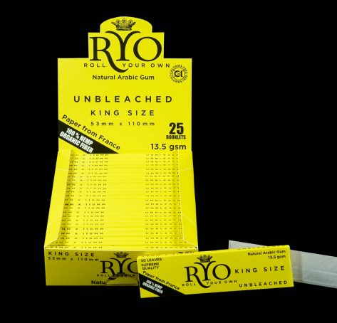 RYO cigarette rolling papers are manufactured and gummed in France using Natural Arabic gum and are non-GMO, vegan and chlorine free.  They are made from the same material used by the world’s leading brands but are available at more affordable prices.